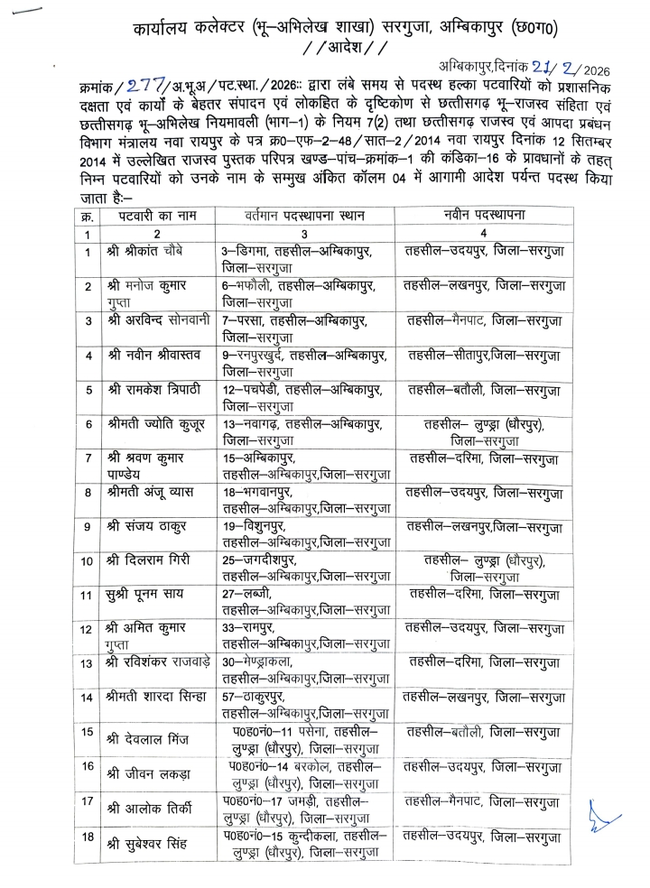 जिला पंचायत सरगुजा में लंबित निर्माण कार्यों को लेकर कलेक्टर के सख्त निर्देश अपूर्ण कार्य पूर्ण किए बिना नई स्वीकृति नहीं अम्बिकापुर। जिला पंचायत सरगुजा अंतर्गत वित्तीय वर्ष 2017-18 से जनवरी 2024 तक विभिन्न योजनाओं में स्वीकृत निर्माण कार्यों की समीक्षा को लेकर कलेक्टर महोदय द्वारा सख्त निर्देश जारी किए गए हैं। दिनांक 17 जनवरी 2026 को आयोजित समीक्षा बैठक में कलेक्टर महोदय ने जिले में स्वीकृत निर्माण कार्यों की पूर्ण एवं अपूर्ण स्थिति की जानकारी प्रमाण-पत्र ‘अ’ एवं ‘ब’ के माध्यम से जिला कार्यालय को प्रेषित करने के निर्देश दिए हैं। जारी निर्देशों के अनुसार, जिन ग्राम पंचायतों में उक्त अवधि के अंतर्गत किसी भी योजना का निर्माण कार्य अपूर्ण है, उन ग्राम पंचायतों में किसी भी योजना से नवीन निर्माण कार्य की स्वीकृति नहीं दी जाएगी, जब तक कि पूर्व में